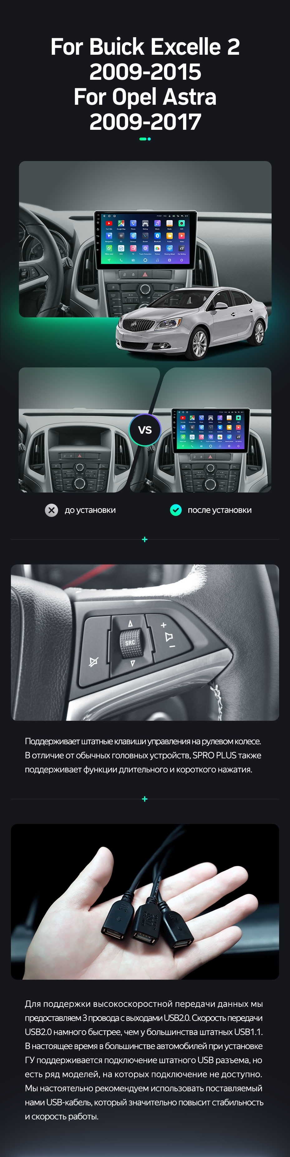 | USB | 3×USB 2.0 + USB 3.0 | Доп. аксессуары | Передняя/задняя AHD-камера, DVR-регистратор, TPMS, парковочный OBD, Type-C → HDMI |