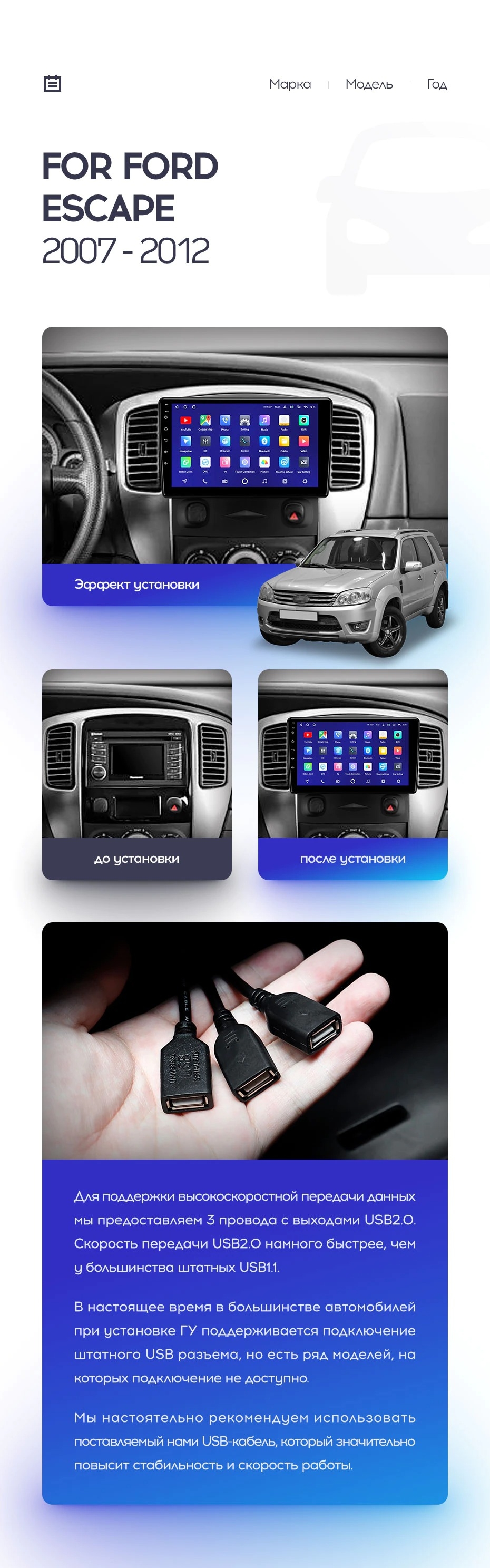 Полный комплект установки магнитолы Teyes с рамкой и проводкой можно выбрать в каталоге штатных магнитол Ford Escape (2007-2012).