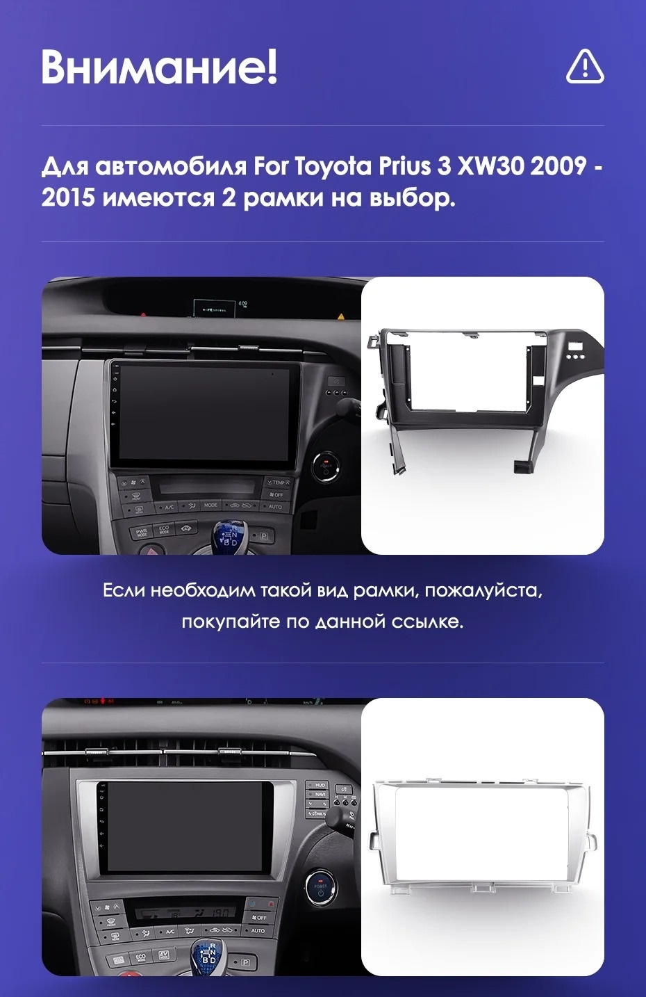 Установочный комплект для Toyota Prius 3 XW30 (2009-2015) включает переходную рамку и проводку.