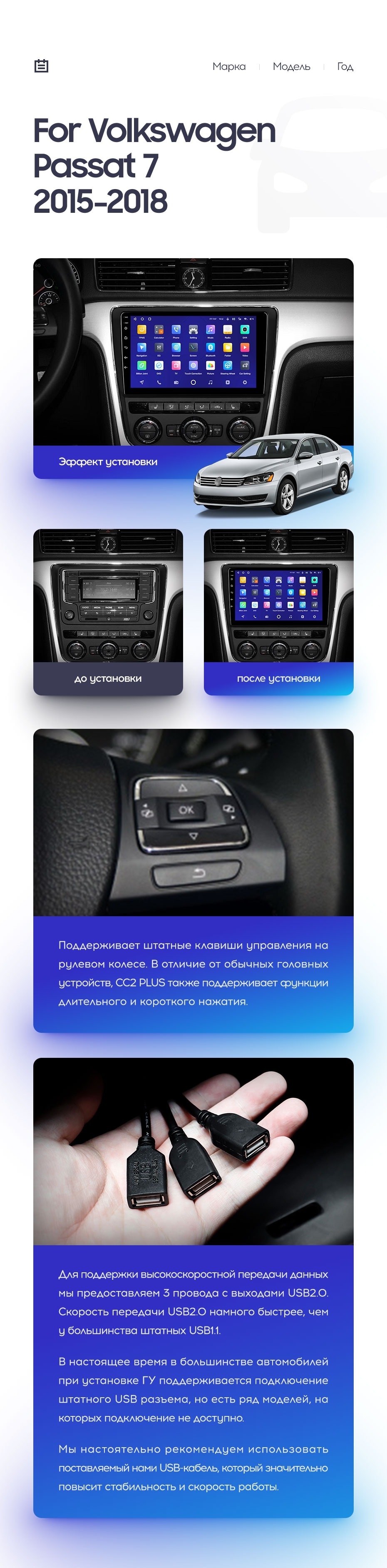 Полный комплект установки магнитолы Teyes с рамкой и проводкой можно выбрать в каталоге штатных магнитол Volkswagen Passat 7 B7 (2015-2018).