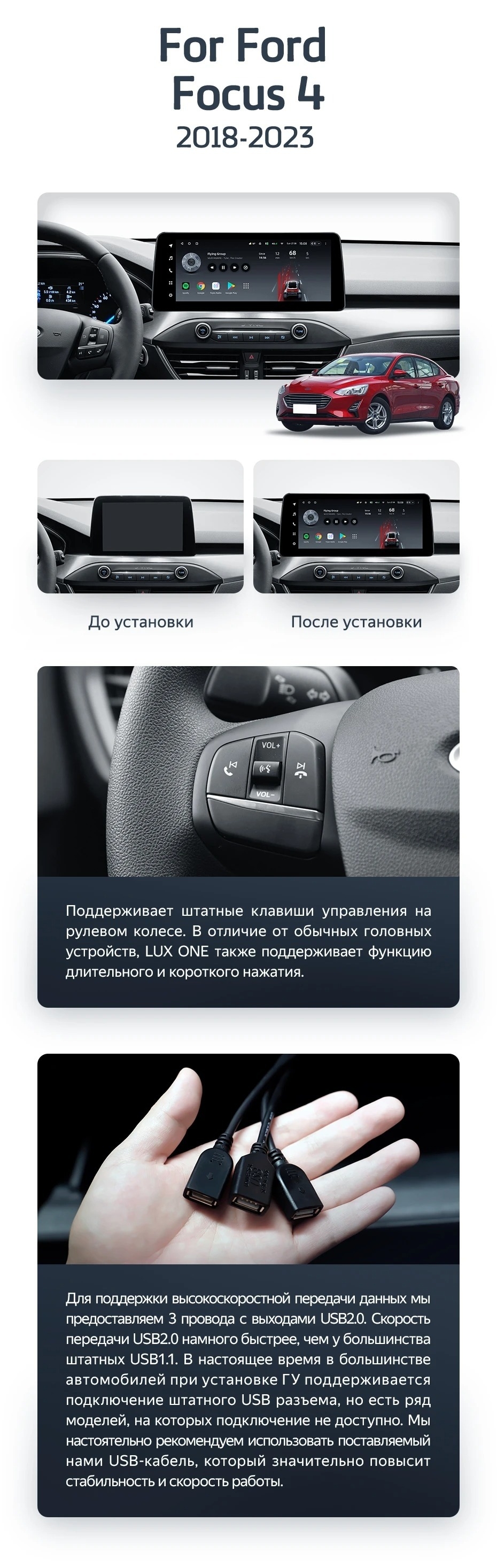 Установочный комплект для Ford Focus 4 Mk 4 (2018-2023) включает переходную рамку и проводку.