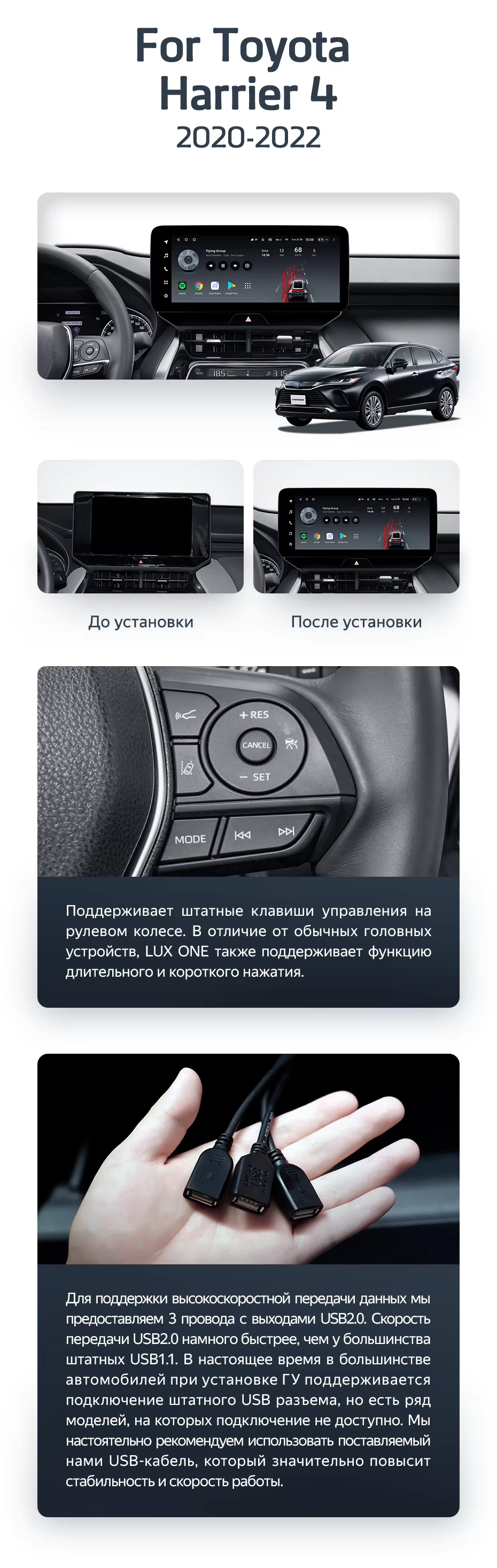 Полный комплект установки магнитолы Teyes с рамкой и проводкой можно выбрать в каталоге штатных магнитол Toyota Harrier 4 XU80 (2020-2022).